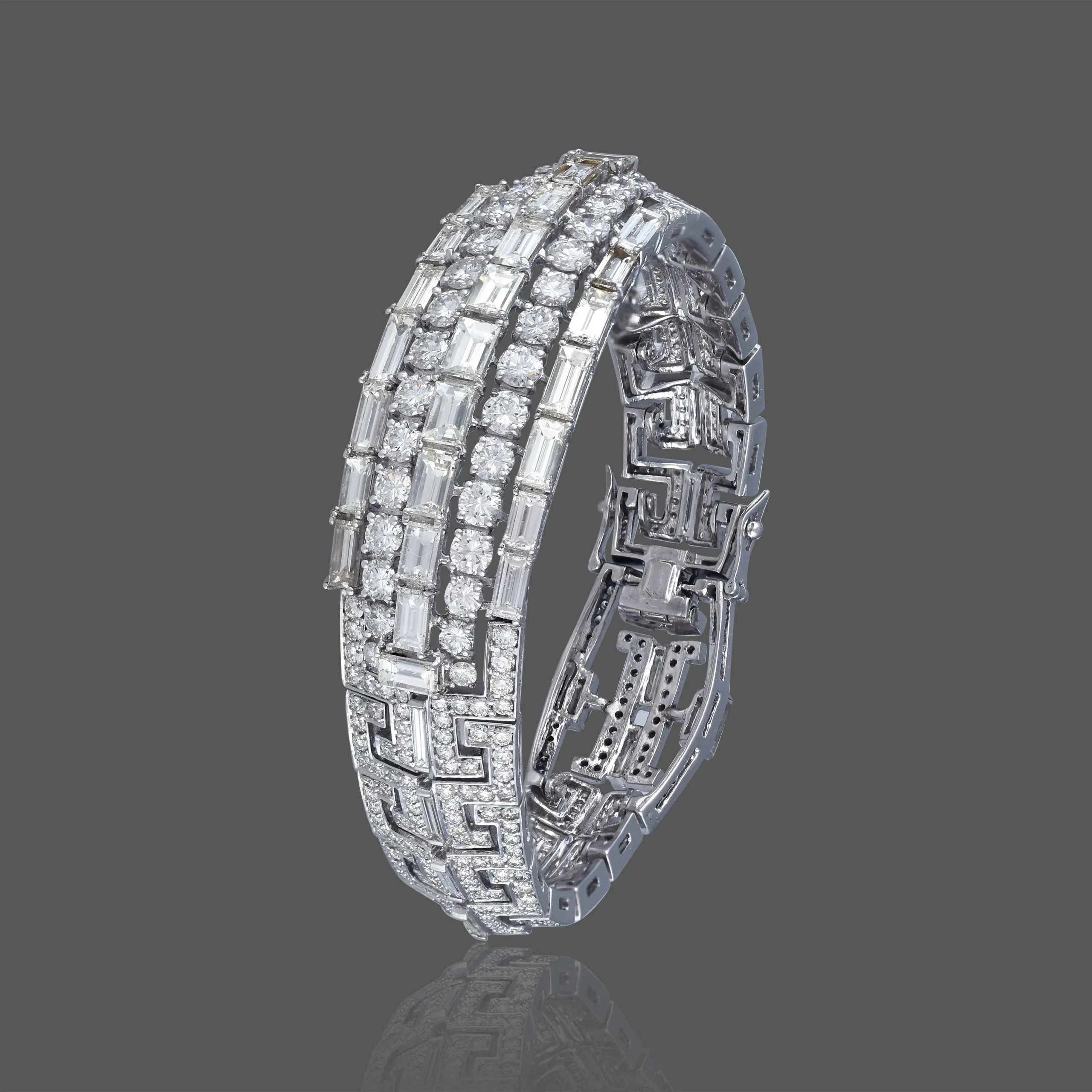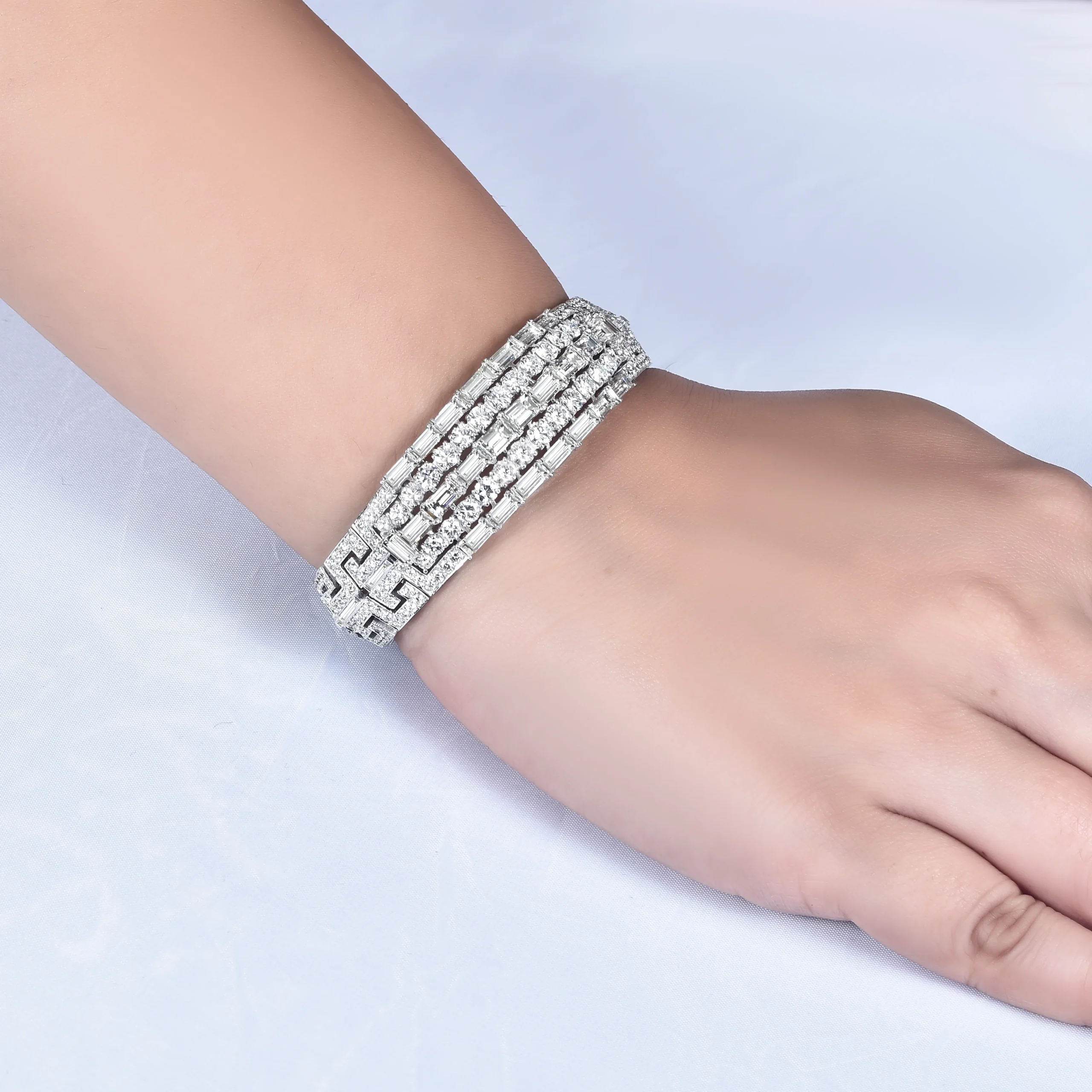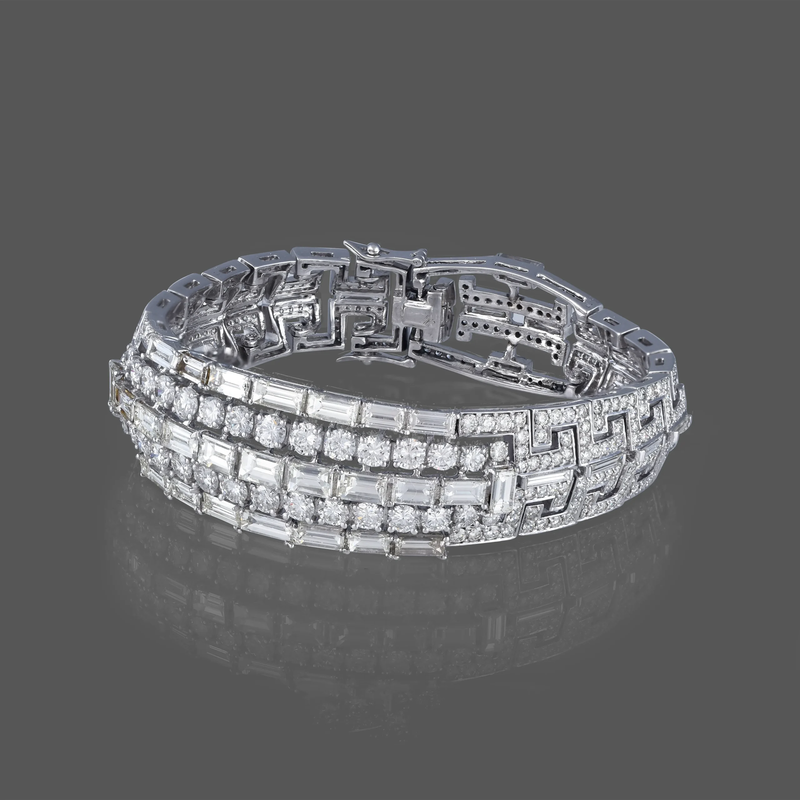 A timeless symphony of brilliance, the Eterna Luxe bracelet features meticulously set baguette and round-cut diamonds in a striking geometric design. Crafted in 18K white gold, it exudes architectural elegance and modern opulence—perfect for evening allure or heirloom prestige.