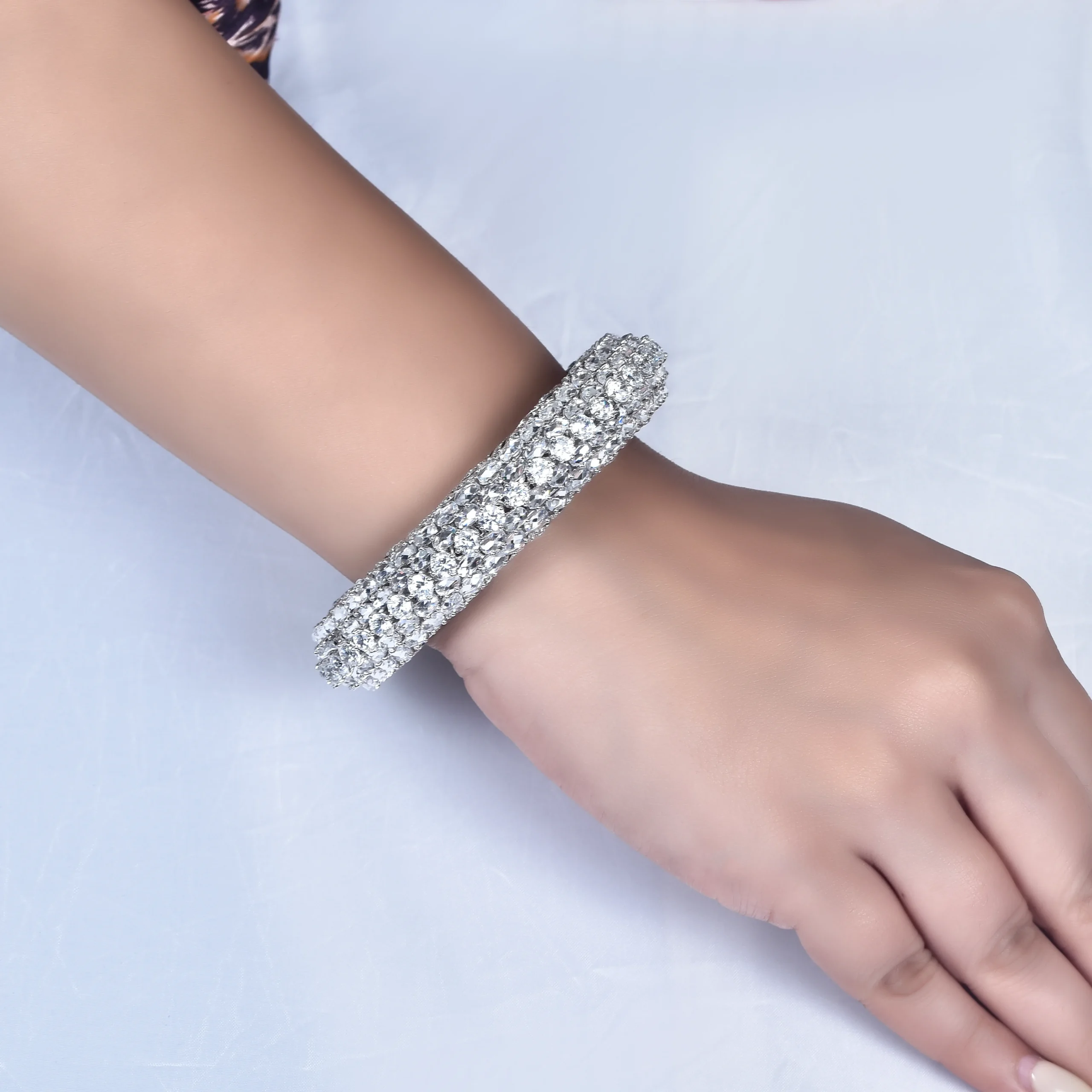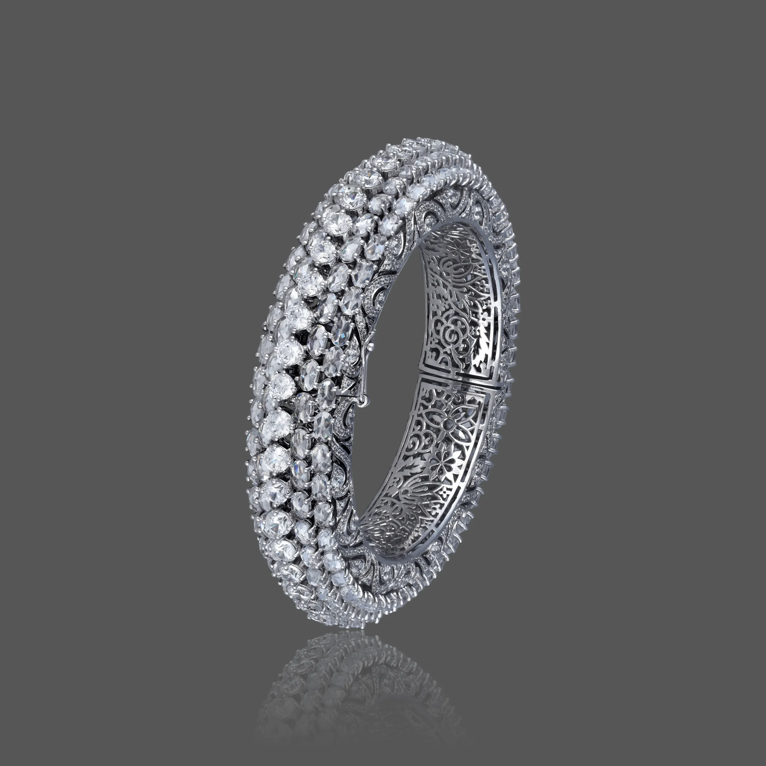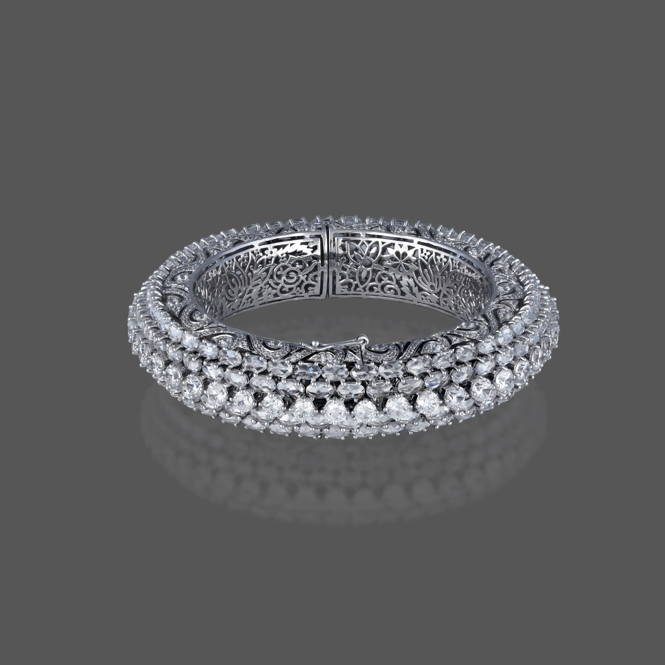 A masterpiece of brilliance, the Celeste Diamond Bangle is encrusted with rows of sparkling diamonds and detailed with ornate filigree work. Perfectly blending heritage craftsmanship with modern elegance.