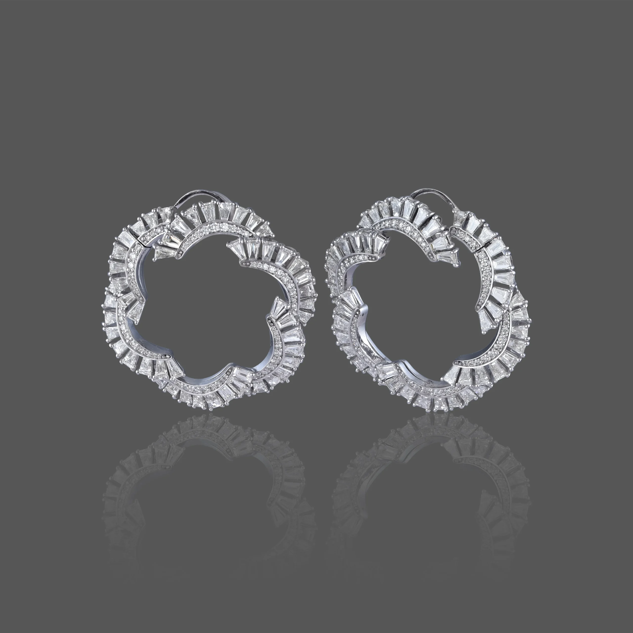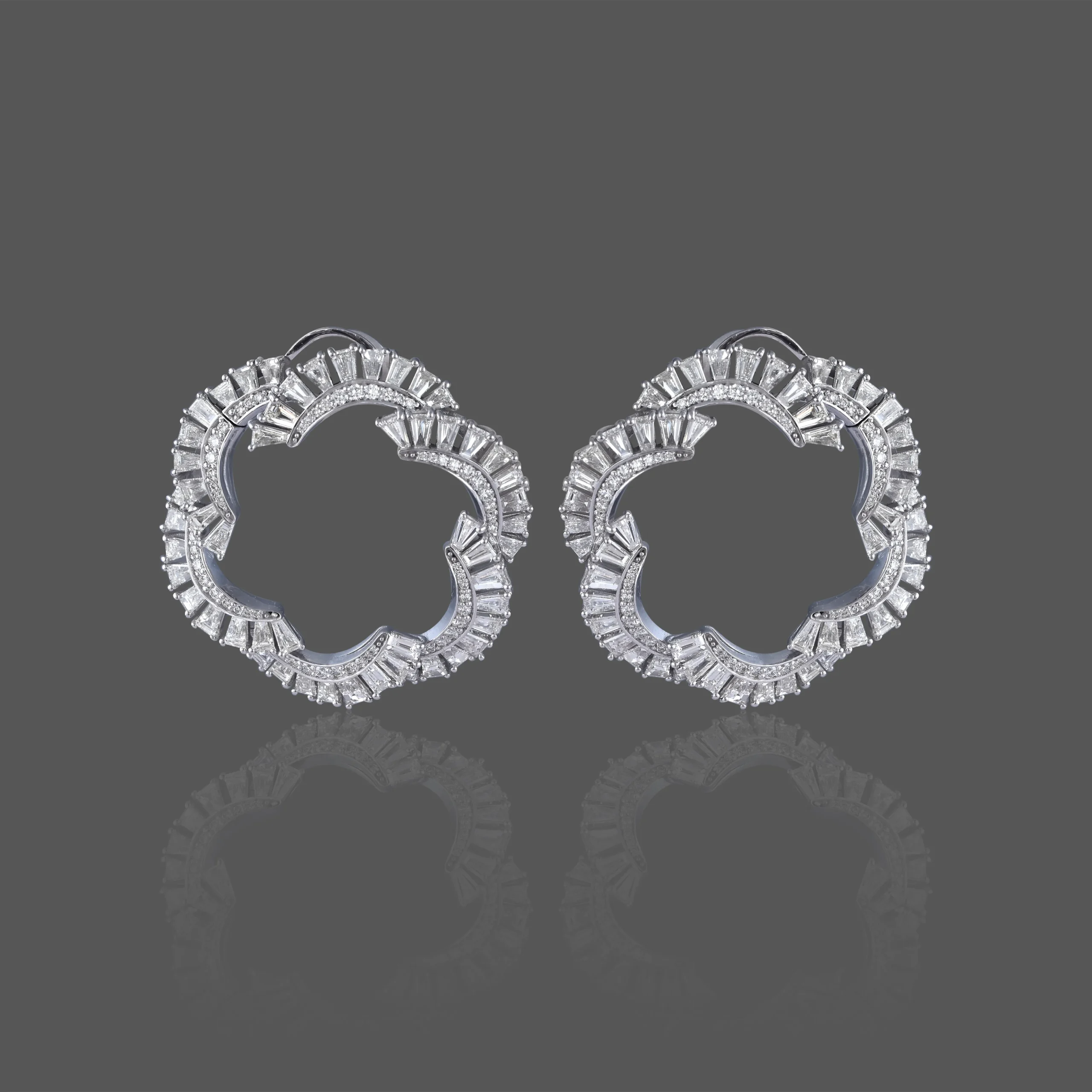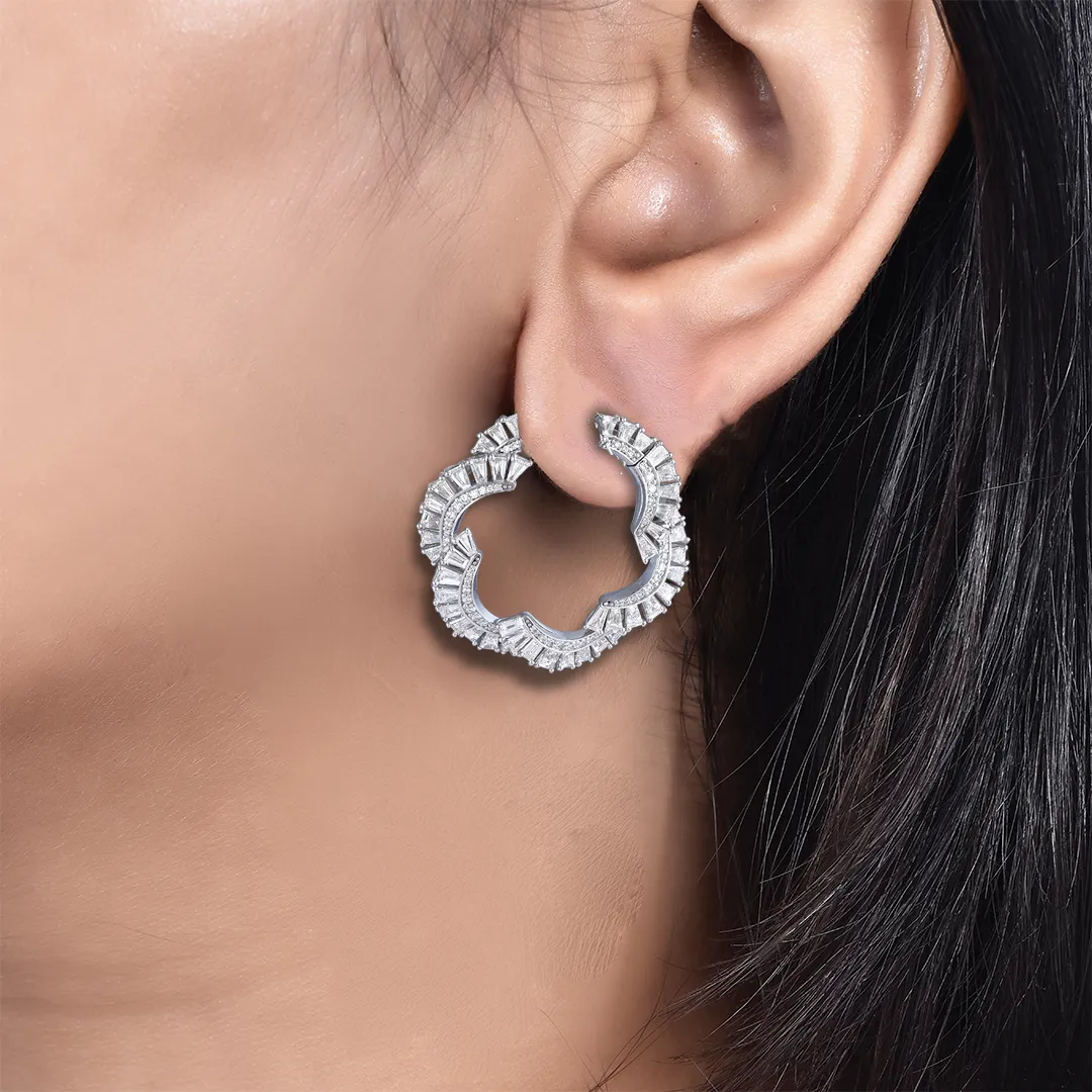 A sculptural symphony of light, the Luna Cascade Earrings feature intricately set baguette and brilliant-cut diamonds that trace a graceful, floral-inspired silhouette. Radiating timeless elegance with a contemporary edge, these earrings are a true celebration of refined craftsmanship and bold sophistication.