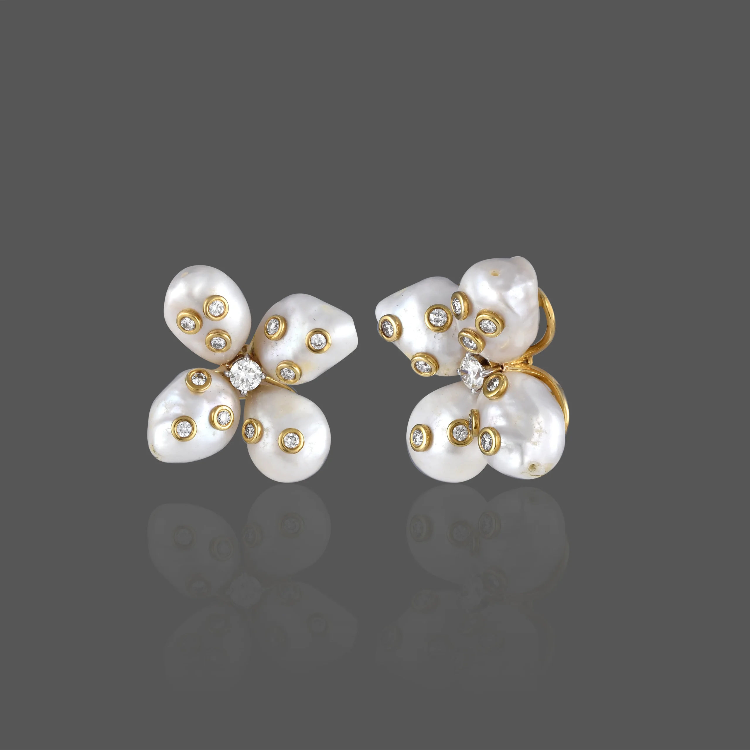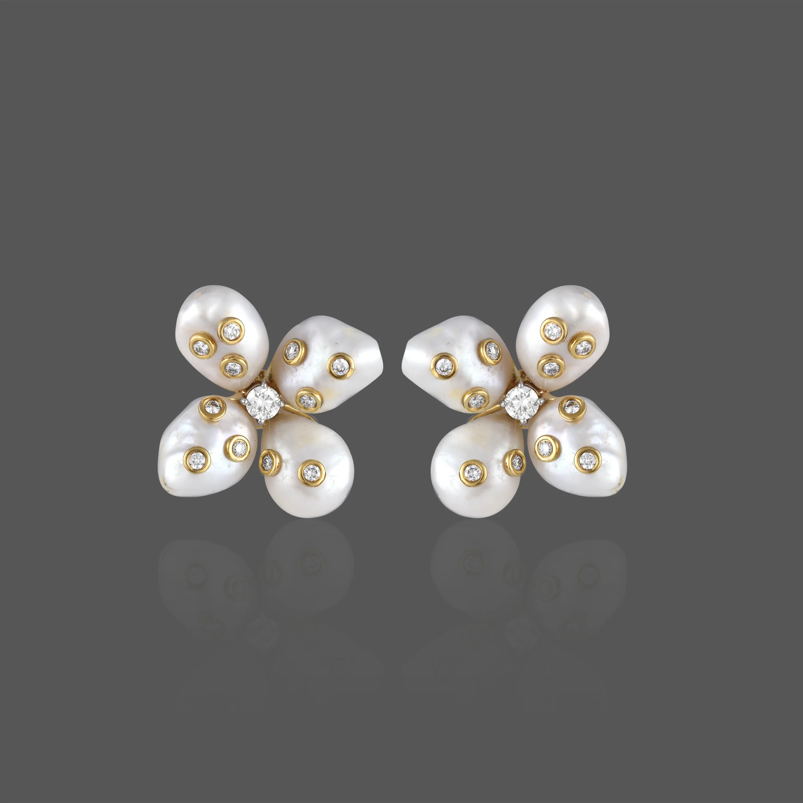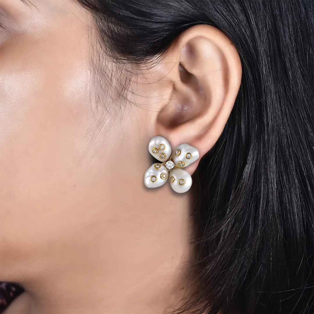 Delicate as a whisper, these earrings bloom with natural pearls shaped like petals, accented with golden diamond-studded inlays. A radiant center stone adds the perfect glimmer, making this floral-inspired design a refined symbol of grace and rare beauty.